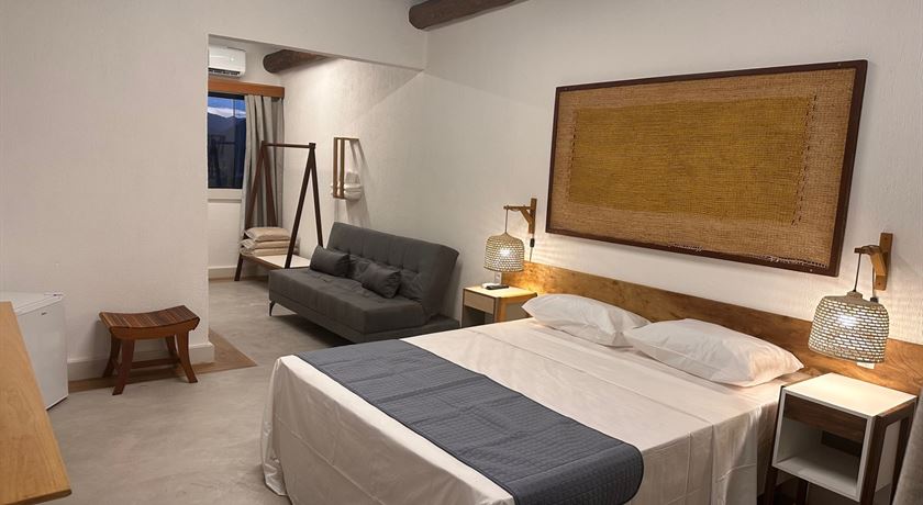 Suíte com varanda, ar condicionado, Smart TV, frigobar, sofá-cama e banheiro completo.