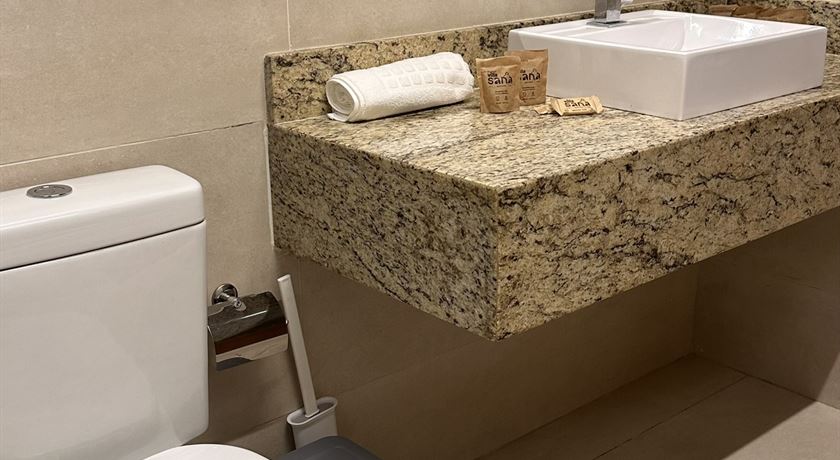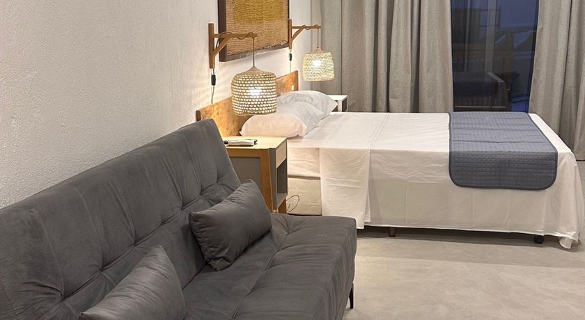 Suíte com varanda, ar condicionado, Smart TV, frigobar, sofá-cama e banheiro completo.